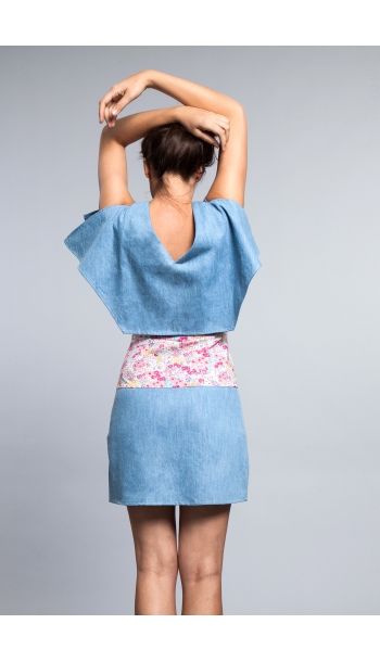 Une allure fraîche ! Cette déclinaison de la robe EGERIE en denim clair au tombé impeccable, associé à un tissu floral japonais d'esprit kimono, structurera en douceur votre silhouette.